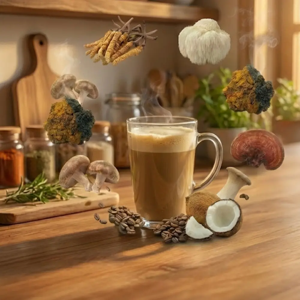 Ce produit phare se présente sous la forme d'un mélange soluble associant un café 100 % Arabica à une base de lait de coco pour la texture. Sa composition unique inclut des dosages précis de six champignons fonctionnels, offrant une teneur en caféine trois fois inférieure à celle d'un café standard. Cette formulation est exempte de gluten, de lactose et de sucre, s'adaptant ainsi à la majorité des régimes alimentaires actuels.
