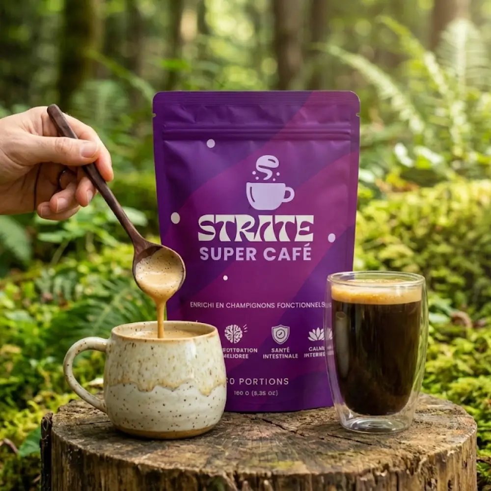 La spécialité unique de la marque réside dans son Strate Super Café, une boisson instantanée qui concentre le meilleur de la mycothérapie. La différenciation majeure de ce produit par rapport aux compléments classiques est son format galénique : une poudre soluble qui se prépare en quelques secondes, intégrant directement six variétés de champignons soigneusement dosées.